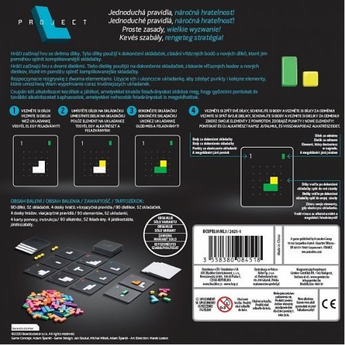 Skládejte efektivně dílky, zdokonalujte strategii a vyhrajte hru! Ve hře Project L se budete ze svých dílků snažit skládat skládačky jednu po druhé tak, abyste dílky využili optimálně a získali co nejvíce bodů. Hráči začínají hru se dvěma dílky. Tyto dílky použijí k dokončení skládaček, získání vítězných bodů a nových dílků, které jim pomohou splnit komplikovanější skládačky. Dílky se podle své velikosti dělí na čtyři úrovně. Skládačky se dělí podle barvy rubu karty na bílé a černé. Bíle mají jednodušší tvary, černé složitější. Čím je skládačka složitější, tím více za ní dostanete bodů. Hra obsahuje i variantu pro 1 hráče. Obsah balení: 90 dílků, 52 skládaček, 4 desky hráčů, 1 česká, slovenská, polská a maďarská pravidla.