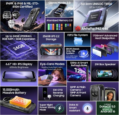 Telefon pohání moderní 6nm procesor Unisoc T8100 s podporou 5G sítí, který zajišťuje bleskové stahování dat a nízkou latenci. Systém je optimalizován pro práci s umělou inteligencí (DokeOS 5.0 / Android 16), což zahrnuje chytré asistenty pro zvýšení produktivity. S 8 GB až 12 GB fyzické RAM (rozšířitelné o dalších až 36 GB virtuálně) je multitasking naprosto plynulý i při běhu náročných podnikových aplikací.