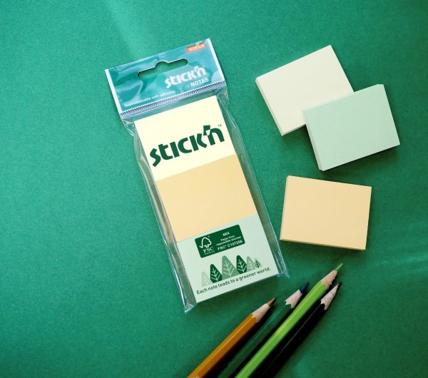 • Samolepicí bločky v mixu pastelových barev vyrobené z papíru, který pochází z ekologicky obhospodařovaných lesů