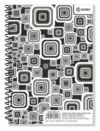 Výrazný blok A5 v černobílém designu obsahuje 50 linkovaných listů. <br> <br>Designově nepřehlédnutelný a zajímavý černobílý poznámkový blok s boční plastovou spirálou. Náplní těchto bloků je bezdřevý linkovaný papír, který se ideálně hodí na psaní různých poznámek v práci nebo ve škole. <br> <br>Boční plastová vazba umožňuje snadné otáčení a odtrhávání stránek. Plastová vinutá spirála má tvarovou paměť, je pevná a zdravotně nezávadná.