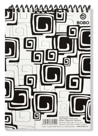 Výrazný blok A5 v černobílém designu obsahuje 50 linkovaných listů. br brDesignově nepřehlédnutelný a zajímavý černobílý poznámkový blok s horní plastovou spirálou. Náplní těchto bloků je bezdřevý linkovaný papír, který se ideálně hodí na psaní různých poznámek v práci nebo ve škole. br brHorní plastová vazba umožňuje snadné otáčení a odtrhávání stránek. Plastová vinutá spirála má tvarovou paměť, je pevná a zdravotně nezávadná.