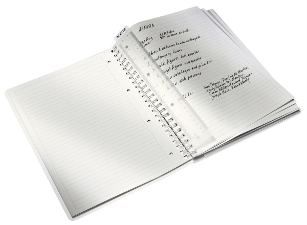 Dvoubarevné PP desky s WOW barvami a embosovaným povrchem, uvnitř čistě bílé 80 listů kvalitního neprůhledného papíru (80 g/m2) s certifikací FSC® Mikro perforované a děrované listy papíru pro snadné …