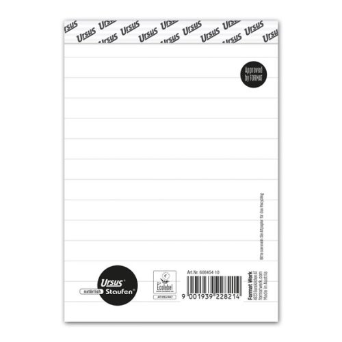 Linkovaný blok A6 – sešívaný, s mikroperforací Kompaktní linkovaný blok A6 se sešívanou vazbou a potištěným přehybem pro pevné držení Mikroperforace umožňuje snadné a čisté odtržení listů Vyroben z ECF …