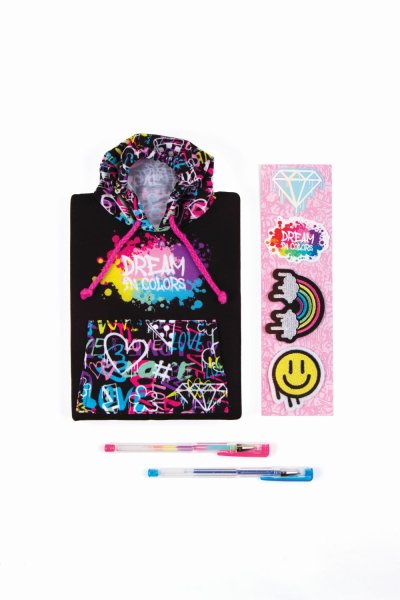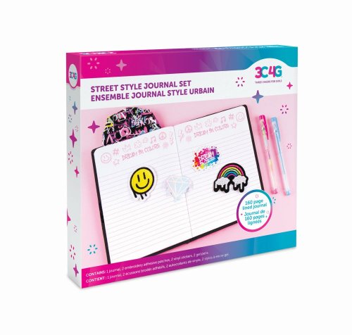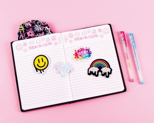 Designový blok ve stylu street look. Blok má na hlavních deskách kapuci. Zapiš si do bloku tvé zážitky nebo třeba tajné sny. Součástí balení jsou dvě propisky, samolepky a lepící nášivky. Vhodné pro dívky od 6 let.