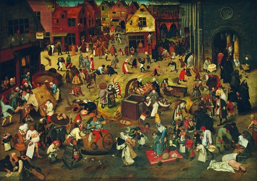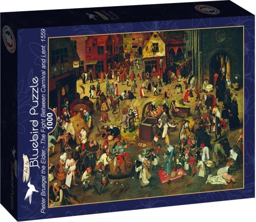 Olej na desce z r.1559 zachycuje společný svátek tohoto období tak, jak se slaví v jižním Nizozemí. Ukazuje kontrast mezi dvěma stránkami života - hostinec vlevo pro potěšení a kostel vpravo pro náboženskou víru a její dodržování. Rozměr složeného puzzle cca 68,3 x 48 cm
