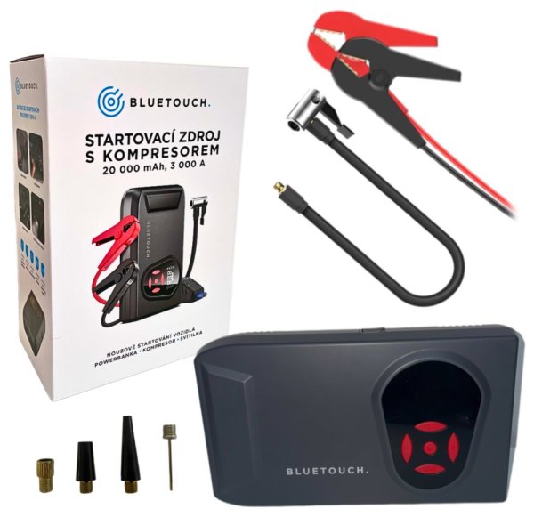Multifunkční powerbanka o kapacitě 20 000 mAh se startovacími svorkami, kompresorem a praktickou LED svítilnou. Tento všestranný pomocník vás nikdy nezklame – nejenže snadno nastartuje automobil, motocykl nebo čtyřkolku s vybitou baterií, ale také dofoukne kolo nebo rychle nabije telefon a další elektronická zařízení. Zařízení je vybaveno pokročilými bezpečnostními prvky, jako je ochrana proti přehřátí, nadměrnému proudu a nízkým nebo vysokým teplotám. S tímto multifunkčním startovacím zdrojem budete vždy připraveni na nečekané situace a zažijete bezstarostné cestování. Součástí balení je také praktické pouzdro, které zajišťuje snadné uskladnění startovacího zdroje a veškerého příslušenství, jako jsou kabely ke kompresoru, startovací svorky, USB-C kabel a sada koncovek ke kompresoru.