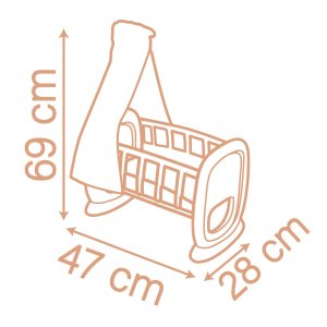 Kolébka pro panenku Smoby Baby Nurse s látkovou stříškou je kolébka a postýlka pro panenky zároveň. Látková stříška je snímatelná a pratelná, kvalitní plast lze snadno očistit vlhkým hadříkem. Vhodné pro panenky do 42 cm (panenka není součástí balení). Tento výrobek obsahuje minimálně 62 % recyklovaného materiálu. Rozměry produktu (DxŠxV): 47x 28 x 69 cm.