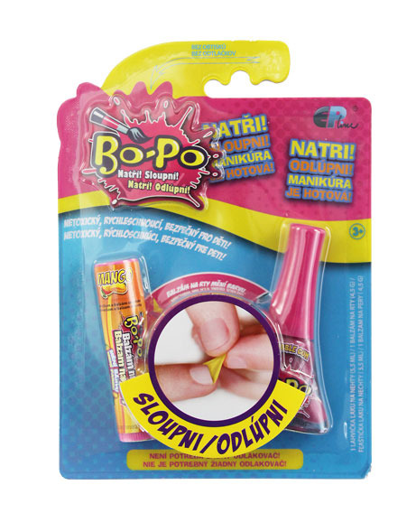 Užijte si krásné nehty se slupovacími laky Bo-Po. Je to vážně jednoché. Už žádný odlakovač. Naneste lak, nechte ho zaschnout. Chcete si užít novou barvu? Lak jednoduše sloupněte. Pozor! Tato sada obsahuje jeden lak, ale také balzám na rty, který mění barvu. Obsahuje: 1 Bo-Po lak a 1 balzám na rty (Zmrzlina nebo Mango)