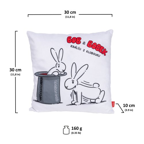 Bob a Bobek, Polštář cvičit. Velikost 30x30cm. Měkoučký polštářek s motivem králiků z klobouku Boba a Bobka. Vhodný do postýlky, na cesty i jako dekorace do dětského pokojíčku. Materiál mikrovelur, obrázek tisk, náplň duté vlákno. Praní na 30°C, 100% polyester. Vyrobeno ručně v ČR.