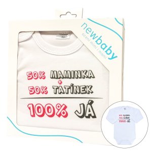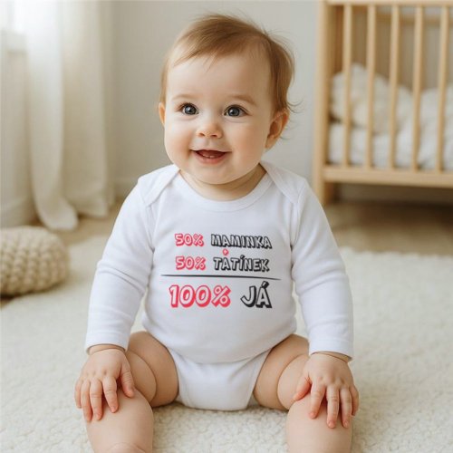 Originální bavlněné kojenecké body s dlouhým rukávem New Baby, s vtipným nápisem 50% MAMINKA + 50% TATÍNEK - 100% JÁ. Body má kolem krčku, nožiček a ručiček barevné lemování. Barvy použité k potisku jsou certifikované a vhodné pro miminka. Je vyrobeno z příjemného a kvalitního materiálu, ve kterém se bude Vaše miminko cítit příjemně. Body má zapínáni na cvočky na ramínku a mezi nožičkami, což usnadňuje oblékání a přebalování. Dopřejte Vašemu miminku vyniknout v originálním body. Složení: 100% bavlna. Rozměry: obvod kolem hrudníku cca 36 cm, délka rukávu cca 18 cm, celková délka cca 32 cm.<BR>- Produkt české značky