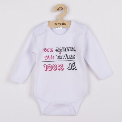 Originální bavlněné kojenecké body s dlouhým rukávem New Baby, s vtipným nápisem 50% MAMINKA + 50% TATÍNEK - 100% JÁ. Body má kolem krčku, nožiček a ručiček barevné lemování. Barvy použité k potisku jsou certifikované a vhodné pro miminka. Je vyrobeno z příjemného a kvalitního materiálu, ve kterém se bude Vaše miminko cítit příjemně. Body má zapínáni na cvočky na ramínku a mezi nožičkami, což usnadňuje oblékání a přebalování. Dopřejte Vašemu miminku vyniknout v originálním body. Složení: 100% bavlna. Rozměry: obvod kolem hrudníku cca 50 cm, délka rukávu cca 26 cm, celková délka cca 42 cm.<BR>- Produkt české značky