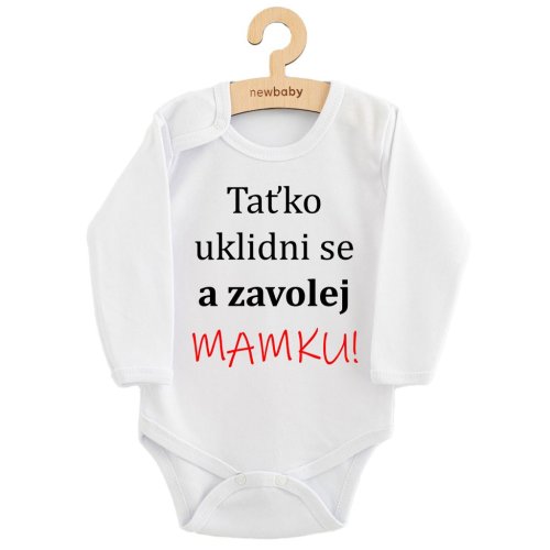 Originální bavlněné kojenecké body s dlouhým rukávem New Baby, s vtipným nápisem Taťko uklidni se a zavolej MAMKU! Barvy použité k potisku jsou certifikované a vhodné pro miminka. Je vyrobeno z příjemného a kvalitního materiálu, ve kterém se bude Vaše miminko cítit příjemně. Body má zapínáni na cvočky na ramínku a mezi nožičkami, což usnadňuje oblékání a přebalování. Dopřejte Vašemu miminku vyniknout v originálním body. Složení: 100% bavlna. Rozměry: obvod kolem hrudníku cca 40 cm, délka rukávu cca 22 cm, celková délka cca 36 cm.<BR>Produkt české značky