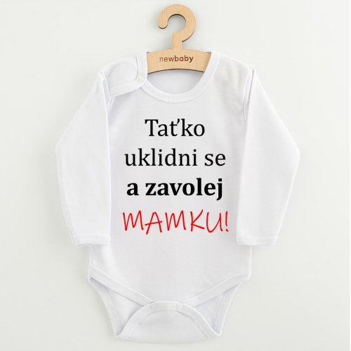 Originální bavlněné kojenecké body s dlouhým rukávem New Baby, s vtipným nápisem Taťko uklidni se a zavolej MAMKU! Barvy použité k potisku jsou certifikované a vhodné pro miminka. Je vyrobeno z příjemného a kvalitního materiálu, ve kterém se bude Vaše miminko cítit příjemně. Body má zapínáni na cvočky na ramínku a mezi nožičkami, což usnadňuje oblékání a přebalování. Dopřejte Vašemu miminku vyniknout v originálním body. Složení: 100% bavlna. Rozměry: obvod kolem hrudníku cca 42 cm, délka rukávu cca 23 cm, celková délka cca 38 cm.<BR>Produkt české značky