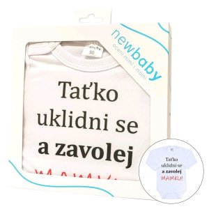 Originální bavlněné kojenecké body s dlouhým rukávem New Baby, s vtipným nápisem Taťko uklidni se a zavolej MAMKU! Barvy použité k potisku jsou certifikované a vhodné pro miminka. Je vyrobeno z příjemného a kvalitního materiálu, ve kterém se bude Vaše miminko cítit příjemně. Body má zapínáni na cvočky na ramínku a mezi nožičkami, což usnadňuje oblékání a přebalování. Dopřejte Vašemu miminku vyniknout v originálním body. Složení: 100% bavlna. Rozměry: obvod kolem hrudníku cca 50 cm, délka rukávu cca 26 cm, celková délka cca 42 cm.