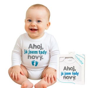 Originální bavlněné kojenecké body s dlouhým rukávem New Baby, s vtipným nápisem Ahoj, já jsem tady nový. Barvy použité k potisku jsou certifikované a vhodné pro miminka. Je vyrobeno z příjemného a kvalitního materiálu, ve kterém se bude Vaše miminko cítit příjemně. Body má zapínáni na cvočky na ramínku a mezi nožičkami, což usnadňuje oblékání a přebalování. Dopřejte Vašemu miminku vyniknout v originálním body. Složení: 100% bavlna. Rozměry: obvod kolem hrudníku cca 36 cm, délka rukávu cca 18 cm, celková délka cca 32 cm.<BR>- Produkt české značky