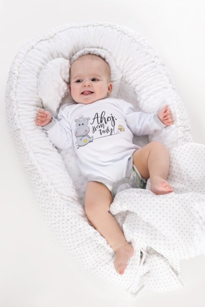 Originální bavlněné kojenecké body s dlouhým rukávem New Baby, s roztomilým obrázkem a nápisem Ahoj, jsem tady! Barvy použité k potisku jsou certifikované a vhodné pro miminka. Je vyrobeno z příjemného a kvalitního materiálu, ve kterém se bude Vaše miminko cítit příjemně. Body má zapínáni na cvočky na ramínku a mezi nožičkami, což usnadňuje oblékání a přebalování. Dopřejte Vašemu miminku vyniknout v originálním body. Složení: 100% bavlna. Rozměry: obvod kolem hrudníku cca 38 cm, délka rukávu cca 21 cm, celková délka cca 33 cm.<BR>- Produkt české značky
