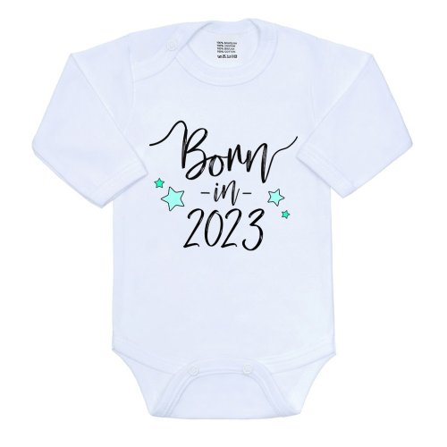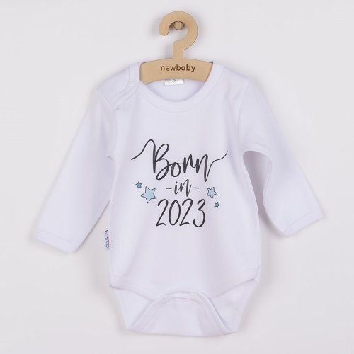 Originální bavlněné kojenecké body s dlouhým rukávem New Baby s nápisem Born in 2023. Barvy použité k potisku jsou certifikované a vhodné pro miminka. Je vyrobeno z příjemného a kvalitního materiálu, ve kterém se bude Vaše miminko cítit příjemně. Body má zapínáni na cvočky na ramínku a mezi nožičkami, což usnadňuje oblékání a přebalování. Dopřejte Vašemu miminku vyniknout v originálním body. Složení: 100% bavlna.<BR>- Produkt české značky