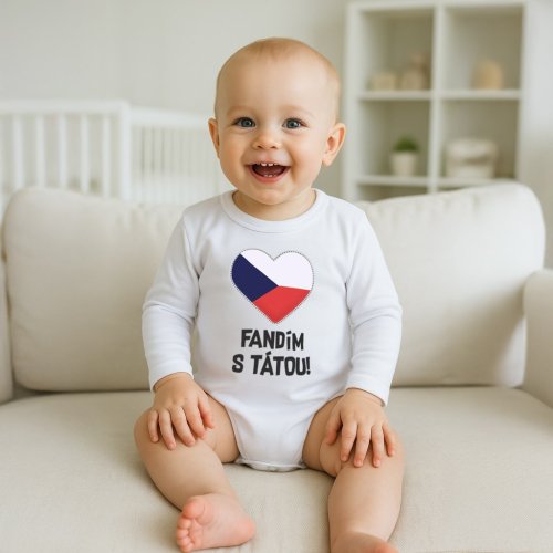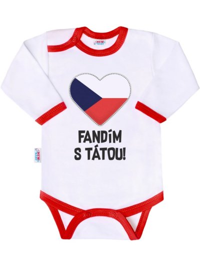 Originální bavlněné kojenecké body s dlouhým rukávem New Baby, s vtipným nápisem Fandím s tátou a obrázkem české vlajky. Body má kolem krčku, nožiček a ručiček barevné lemování. Barvy použité k potisku jsou certifikované a vhodné pro miminka. Je vyrobeno z příjemného a kvalitního materiálu, ve kterém se bude Vaše miminko cítit příjemně. Body má zapínáni na cvočky na ramínku a mezi nožičkami, což usnadňuje oblékání a přebalování. Dopřejte Vašemu miminku vyniknout v originálním body. Složení: 100% bavlna. Rozměry: obvod kolem hrudníku cca 36 cm, délka rukávu cca 18 cm, celková délka cca 32 cm.<BR>- Produkt české značky