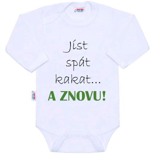 Originální bavlněné kojenecké body s dlouhým rukávem New Baby, s vtipným nápisem jíst spát kakat... A ZNOVU! Barvy použité k potisku jsou certifikované a vhodné pro miminka. Je vyrobeno z příjemného a kvalitního materiálu, ve kterém se bude Vaše miminko cítit příjemně. Body má zapínáni na cvočky na ramínku a mezi nožičkami, což usnadňuje oblékání a přebalování. Dopřejte Vašemu miminku vyniknout v originálním body. Složení: 100% bavlna. Rozměry: obvod kolem hrudníku cca 36 cm, délka rukávu cca 18 cm, celková délka cca 32 cm.<BR>Produkt české značky