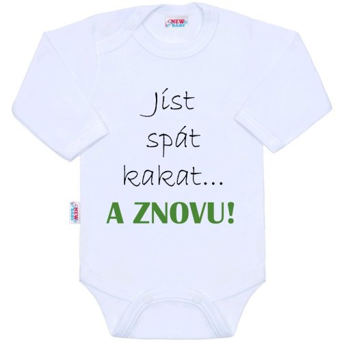 Originální bavlněné kojenecké body s dlouhým rukávem New Baby, s vtipným nápisem jíst spát kakat... A ZNOVU! Barvy použité k potisku jsou certifikované a vhodné pro miminka. Je vyrobeno z příjemného a kvalitního materiálu, ve kterém se bude Vaše miminko cítit příjemně. Body má zapínáni na cvočky na ramínku a mezi nožičkami, což usnadňuje oblékání a přebalování. Dopřejte Vašemu miminku vyniknout v originálním body. Složení: 100% bavlna. Rozměry: obvod kolem hrudníku cca 50 cm, délka rukávu cca 26 cm, celková délka cca 42 cm.<BR>Produkt české značky