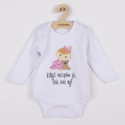 Originální bavlněné kojenecké body s dlouhým rukávem New Baby, s vtipným nápisem Když nespím já, tak ani vy! A obrázkem roztomilé holčičky. Body má kolem krčku, nožiček a ručiček barevné lemování. Barvy použité k potisku jsou certifikované a vhodné pro miminka. Je vyrobeno z příjemného a kvalitního materiálu, ve kterém se bude Vaše miminko cítit příjemně. Body má zapínáni na cvočky na ramínku a mezi nožičkami, což usnadňuje oblékání a přebalování. Dopřejte Vašemu miminku vyniknout v originálním body. Složení: 100% bavlna. Rozměry: obvod kolem hrudníku cca 42 cm, délka rukávu cca 23 cm, celková délka cca 38 cm.<BR>- Produkt české značky