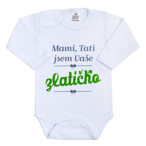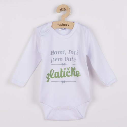 Originální bavlněné kojenecké body s dlouhým rukávem New Baby, s vtipným nápisem Mami, Tati jsem Vaše zlatíčko. Barvy použité k potisku jsou certifikované a vhodné pro miminka. Je vyrobeno z příjemného a kvalitního materiálu, ve kterém se bude Vaše miminko cítit příjemně. Body má zapínáni na cvočky na ramínku a mezi nožičkami, což usnadňuje oblékání a přebalování. Dopřejte Vašemu miminku vyniknout v originálním body. Složení: 100% bavlna. Rozměry: obvod kolem hrudníku cca 50 cm, délka rukávu cca 26 cm, celková délka cca 42 cm.<BR>Produkt české značky