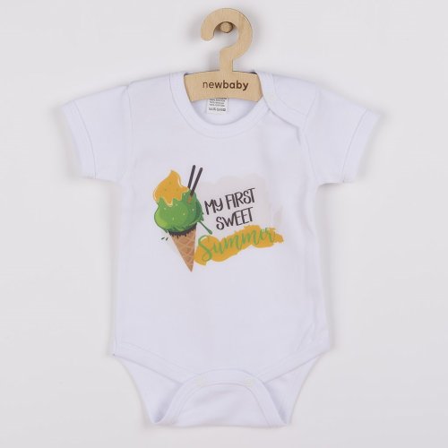Originální bavlněné kojenecké body s krátkým rukávem New Baby s nápisem MY FIRST SWEET Summer a obrázkem chutné zmrzlinky. Barvy použité k potisku jsou certifikované a vhodné pro miminka. Je vyrobeno z příjemného a kvalitního materiálu, ve kterém se bude Vaše miminko cítit příjemně. Body má zapínáni na cvočky na ramínku a mezi nožičkami, což usnadňuje oblékání a přebalování. Dopřejte Vašemu miminku vyniknout v originálním body. Složení: 100% bavlna.<BR>- Produkt české značky