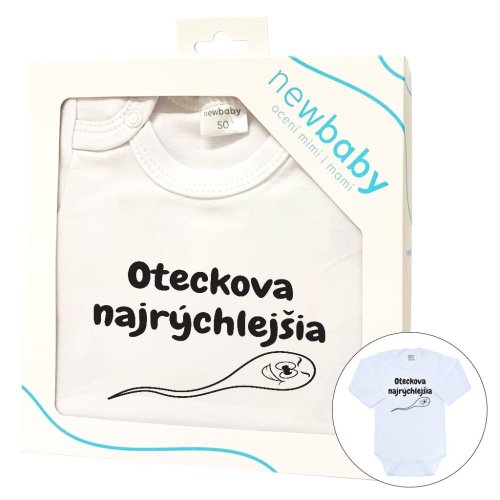 Originální bavlněné kojenecké body s dlouhým rukávem New Baby, s vtipným nápisem OTECKOVA NAJRÝCHLEJŠIA. Barvy použité k potisku jsou certifikované a vhodné pro miminka. Je vyrobeno z příjemného a kvalitního materiálu, ve kterém se bude Vaše miminko cítit příjemně. Body má zapínáni na cvočky na ramínku a mezi nožičkami, což usnadňuje oblékání a přebalování. Dopřejte Vašemu miminku vyniknout v originálním body. Složení: 100% bavlna. Rozměry: obvod kolem hrudníku cca 34 cm, délka rukávu cca 16 cm, celková délka cca 30 cm.<BR>- Produkt české značky