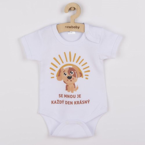 Originální bavlněné kojenecké body s krátkým rukávem New Baby s nápisem SE MNOU JE KAŽDÝ DEN KRÁSNÝ a obrázkem. Barvy použité k potisku jsou certifikované a vhodné pro miminka. Je vyrobeno z příjemného a kvalitního materiálu, ve kterém se bude Vaše miminko cítit příjemně. Body má zapínáni na cvočky na ramínku a mezi nožičkami, což usnadňuje oblékání a přebalování. Dopřejte Vašemu miminku vyniknout v originálním body. Složení: 100% bavlna.<BR>- Produkt české značky
