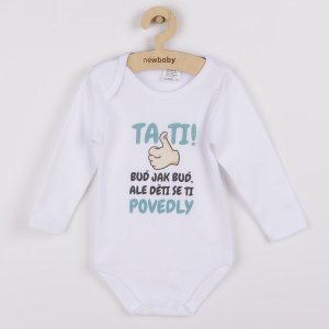 Originální bavlněné kojenecké body s dlouhým rukávem New Baby, s vtipným nápisem TATI, BUĎ JAK BUĎ,ALE DĚTI SE TI POVEDLY. Barvy použité k potisku jsou certifikované a vhodné pro miminka. Je vyrobeno z příjemného a kvalitního materiálu, ve kterém se bude Vaše miminko cítit příjemně. Body má zapínáni na cvočky na ramínku a mezi nožičkami, což usnadňuje oblékání a přebalování. Dopřejte Vašemu miminku vyniknout v originálním body. Složení: 100% bavlna. Rozměry: obvod kolem hrudníku cca 50 cm, délka rukávu cca 26 cm, celková délka cca 42 cm.<BR>Produkt české značky