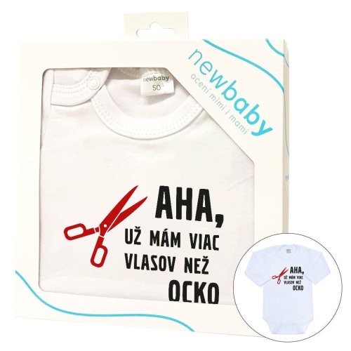 Originální bavlněné kojenecké body s dlouhým rukávem New Baby, s vtipným nápisem AHA UŽ MÁM VIAC VLASOV NEŽ OCKO. Barvy použité k potisku jsou certifikované a vhodné pro miminka. Je vyrobeno z příjemného a kvalitního materiálu, ve kterém se bude Vaše miminko cítit příjemně. Body má zapínáni na cvočky na ramínku a mezi nožičkami, což usnadňuje oblékání a přebalování. Dopřejte Vašemu miminku vyniknout v originálním body. Složení: 100% bavlna. Rozměry: obvod kolem hrudníku cca 46 cm, délka rukávu cca 24 cm, celková délka cca 40 cm.<BR>Produkt české značky