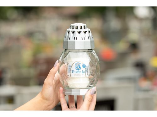 Tato svíčka s diamantovým vzorem poskytuje 24 hodin hoření a je ideální pro hřbitovní dekoraci a vzpomínky na blízké. Její rozměry jsou 18 cm.