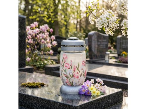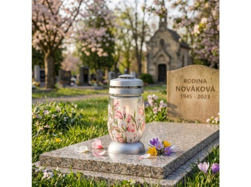 Tato svíčka s motivem magnolie poskytuje 36 hodin hoření. Vhodné ke zkrášlení hřbitovů, pomníků a ostatních míst posledního odpočinku. Její rozměry jsou 23 cm.