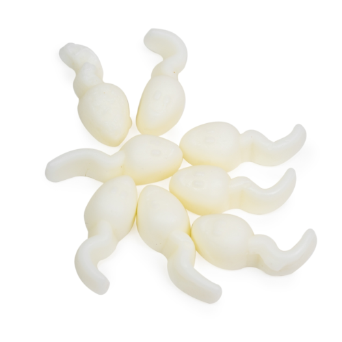 Želatinové bonbóny ve tvaru spermií s příchutí piňa kolády.