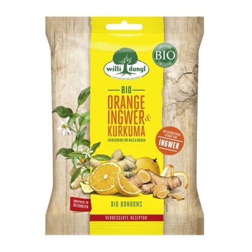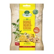 Bio bonbony obsahují vysoce kvalitní suroviny z ekologického zemědělství, zázvor a kurkuma dodávají bonbonům pikantní svěžest, kterou doplňuje ovocná chuť pomeranče
