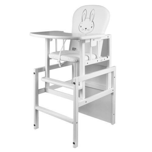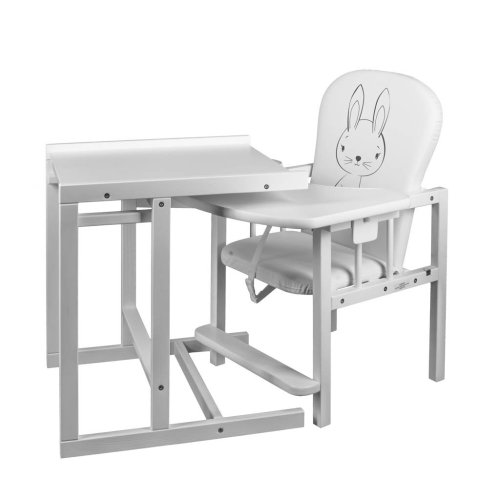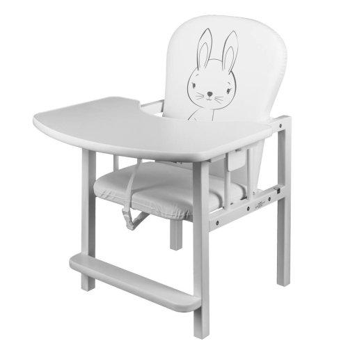 Multifunkční židlička české značky New Baby je vyrobena z kvalitního borovicového dřeva a zdobí ji veselý obrázek králíčka. Jídelní židličku lze rozložit a použít jako samostatný stůl se židličkou, což lze využít také během zábavy. Sedací část je pokryta barevným lehce omyvatelným materiálem, vyplněným molitanem, díky čemuž je židlička velice pohodlná. Veškeré materiály a suroviny používané při výrobě mají potřebné atesty nebo certifikáty, a proto je nábytek značky New Baby zcela bezpečný a odolný.
