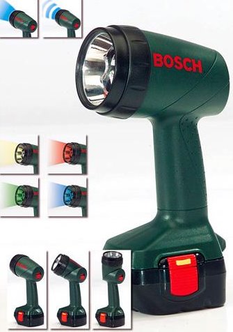 Svítilna Bosch. Otáčením sklíčka na baterce se mění barva světla. Baterka svítí bíle, modře, zeleně nebo červeně. Rozměr balení 15,5x7x26,5 cm. Vhodné pro děti od 3 let.
