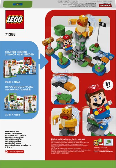 Dopřejte dětem možnost prožívat ve světě LEGO® Super Mario™ nová zábavná dobrodružství díky rozšiřujícímu setu Boss Sumo Bro a padající věž (71388). Obsahuje věž, kterou mohou LEGO® Mario™ nebo LEGO® Luigi™ (figurky nejsou součástí balení) zbořit pomocí páček ve spodní část modelu. Věž lze postavit různě vysokou, a jakmile Boss Sumo Bro padne, objeví se akční kostka Super Star. Sada obsahuje také figurku Crowbera. (Poznámka: Pro plnohodnotný interaktivní herní zážitek je potřeba vlastnit startovací set 71360 nebo 71387.)