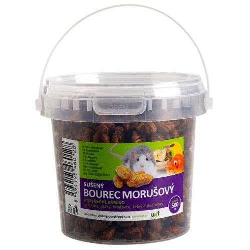 Larvy bource morušového jsou vhodným doplňkem stravy zejména pro kapry KOI, kterým dodají potřebnou energii, podpoří rovnoměrný růst a zbarvení. Dále je vhodný pro hmyzožravé ptáky (exotické, volně žijící, drůbež), drobné savce (potkany, krysy, křečky, ježky, veverky), plazy, ale také pro psy a kočky. Larvy bource obsahují vysoký podíl proteinů (53 %), tuk (27 %) a vlákninu (3 %). Má velmi dobré složení aminokyselin a obsahuje nadprůměrné množství vitaminu B1, B2 a B5. Má výraznou chuť a vůni, proto je u zvířat velmi oblíbený. Analytické složky: proteiny 53%, tuk 28%, vláknina 3%, popel 4%, vlhkost 12% Balení: 500 ml / 150 g