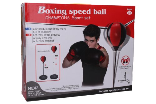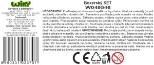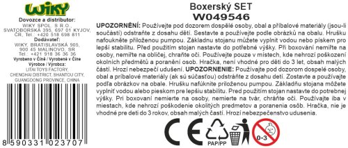 Box set boxovací hruška a rukavice. Rozměry, nastavitelná výška 69x109 cm, rozměry základny 33x33 cm, průměr hrušky 22 cm. Schéma sestavení na obalu. Obsahuje rukavice, sadu na montáž a pumpičku.