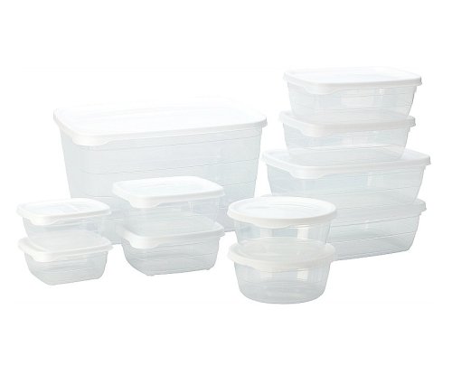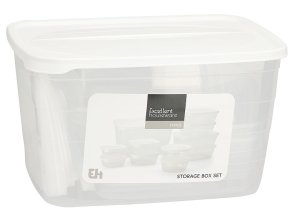 Univerzální sada průhledných úložných krabiček z odolného PP materiálu s bílými víčky. Díky různým velikostem jsou ideální pro uchovávání potravin, uskladnění drobností nebo organizaci domácnosti. Praktické, lehké a snadno stohovatelné.
