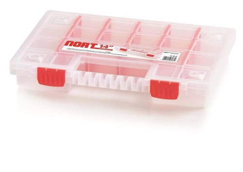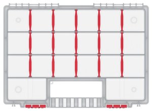 Průhledný organizér. Rozměry: 340x250x50 mm Počet přihrádek: 20 Hmotnost: 416 g Materiál: Plast Množství v balení: 10 ks