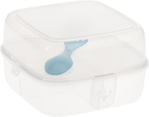 rozměry: 15,5 x 15 x 9,5 cm materiál: plast barva: transparentní součástí boxu je vidlička - lžička mix barev: červená, zelená, modrá
