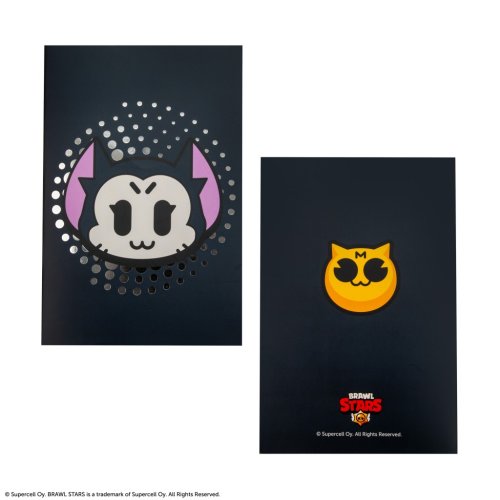 Brawl Stars měkký obal na blok Kit představuje praktický a stylový doplněk pro všechny fanoušky populární hry Brawl Stars. Obal je vyroben z měkkého a odolného materiálu tmavě modré barvy, který efektivně chrání sešit nebo blok před poškozením, nečistotami a běžným opotřebením. Na přední straně dominuje výrazný motiv postavičky z Brawl Stars s fialovými ušima a černo-bílou tváří, která je doplněna o stylové stříbrné tečky vytvářející zajímavý vizuální efekt. Zadní strana obalu je zdobena dalším motivem – žlutou stylizovanou kočičí hlavou s písmenem "M", která doplňuje licenční logo Brawl Stars.