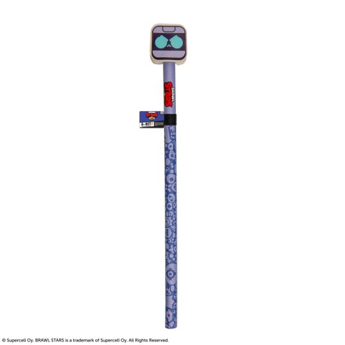 Na horní části tužky je připevněna guma ve tvaru postavičky 8-bit, která je jedním z ikonických hrdinů hry. Guma je barevná, s výrazným designem představujícím obličej této postavy, což současně plní i funkci praktického doplňku k psacím potřebám. Tělo tužky je pokryto drobnými grafickými prvky, které odkazují na herní svět Brawl Stars, a nad nimi je umístěno červené logo Brawl Stars, které tužku jasně identifikuje jako oficiální licenční produkt.