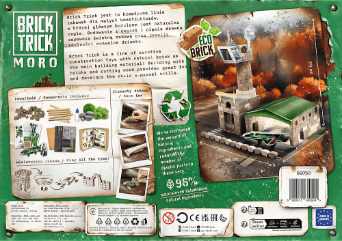 Staňte se stavitelem a vybudujte ze skutečných hliněných cihel a dřeva svoje vlastní vojenské letiště! Skládejte cihlu za cihlou, řežte a lepte prkénka, postupujte od základů až po dokončenou budovu a nakonec svůj výtvor ozdobte přiloženými dekoracemi. Stavte krok za krokem podle návodu nebo najděte a zrealizujte své vlastní řešení. Oživte svou dokončenou stavbu papírovými figurkami. Pokud spojíte několik sad TREFL Brick Trick, můžete vytvořit malebnou vesničku, moderní město nebo středověkou osadu. Stavebnici lze používat opakovaně (lepidlo je rozpustitelné vodou). Balení obsahuje: - více než 360 přírodních hliněných cihliček - dřevěná prkénka - lepidlo - dekorační doplňky - základovou desku - obrázkový návod Stavebnice Brick Trick od výrobce TREFL zlepšují manuální dovednosti, rozvíjí představivost a podporují soustředění. Vhodné pro děti od 6 let. Vyrobeno v EU.
