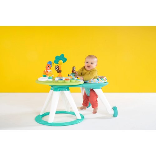 Aktivní centrum Around We Go 2v1 nabízí různé režimy hraní, podporuje několik vývojových milníků vašeho děťátka a umožňuje hru více dětem najednou! Hra s aktivním centrem, které obsahuje otočné sedátko pro snadný přístup ke všem hračkám zaujme děťátko na dlouhou dobu, i když bude na jednom místě. Vaše rodina bude toto multifunkční aktivní centrum využívat celá léta, díky jeho možnosti přizpůsobovat se potřebám děťátka. Když se dítě začne učit stát, odstraňte otočné sedadlo a přeměňte hrací stanici na stolek pro batolata. Zábavu si mohou užít i sourozenci či kamarádi! Aktivní centrum nabízí hru současně pro více dětí. Design ve tvaru tropického ostrova je plný zábavy, která pomáhá dětem trénovat hrubou motoriku. Interaktivní sada bubnů nabízí 2 režimy použití – přepínejte mezi tiki melodiemi a zvuky zvířat, aby byla hra veselá. Obsahuje 10 aktivit: hudební a svítící bubny, točící se zvířátka, cvakající hračka, korálkový labyrint, surfující opička a další.