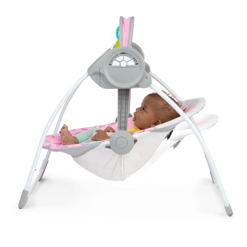 Dopřejte miminku dovolenkovou pohodu s přenosnou houpačkou Bright Starts Pink Paradise. Děťátko se bude klidně houpat v tomto pohodlném sedadle nebo si zábavně hrát s interaktivními hračkami. Můžete si být jisti, že dítě bude v bezpečí a na dohled. Díky 2 polohám sklopení bude houpačka vždy přizpůsobena preferencím vašeho dítěte. Dvě hračky inspirované přírodou, veselý duhový design a kamarádi slůně a opička udrží miminko v dobré společnosti a náladě. Odnímatelná hrazda s hračkami umožňuje snadný přístup k dítěti. S 10 veselými melodiemi je čas houpání zároveň časem písniček a nastavitelný 5-bodový bezpečnostní pás udrží miminko v hlubokém a pohodlném sedadle bezpečně připoutané. Lehký a skládací design umožňuje snadné přenášení nebo skladování. Houpačka je plná užitečných funkcí: technologie TrueSpeed umožňuje výběr z 6 rychlostí houpání, které se přizpůsobí rostoucímu dítěti. Technologie WhisperQuiet zaručí, že jediný zvuk bude šťastné mumlání vašeho děťátka. Houpání a přehrávání melodií funguje na 4 baterie typu C (nejsou součástí balení).