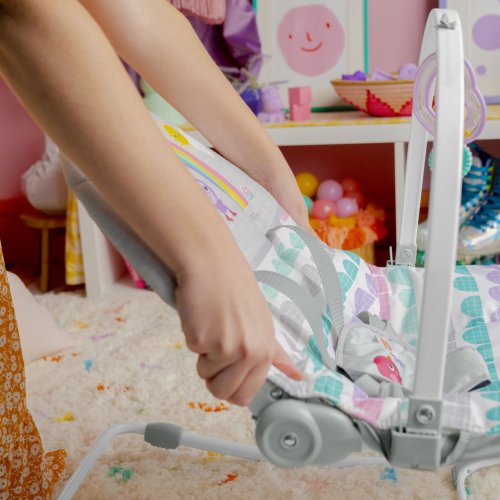 Život s vaším děťátkem je s houpátkem Rosy Rainbow 2 v 1 od Bright Starts růžový, jak jen to jde. Toto sladké víceúčelové houpátko roste spolu s dítětem a je skvělé pro kojence i batolata! Dospělí mohou miminko uklidnit v režimu houpání, zatímco hrazdička s hračkami zabaví shora pomocí chrastítka ve tvaru srdíčka a hračky na honění korálků s květinkami. Vibrující sedátko pomáhá udržet dítě v klidu, zatímco vy máte volné ruce s dítětem na očích.