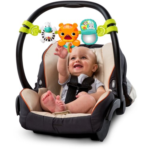 Hračka do kočárku je vhodná pro děti od narození. Nos tygra se rozsvítí a zahraje 4 melodie, když ho dítě stlačí, zebra se otáčí kolem dokola a uvnitř ní chrastí barevné korálky a v otočném zrcátku se může dítě samo vidět.Hračku lze snadno uchytit na většinu kočárků nebo autosedaček.